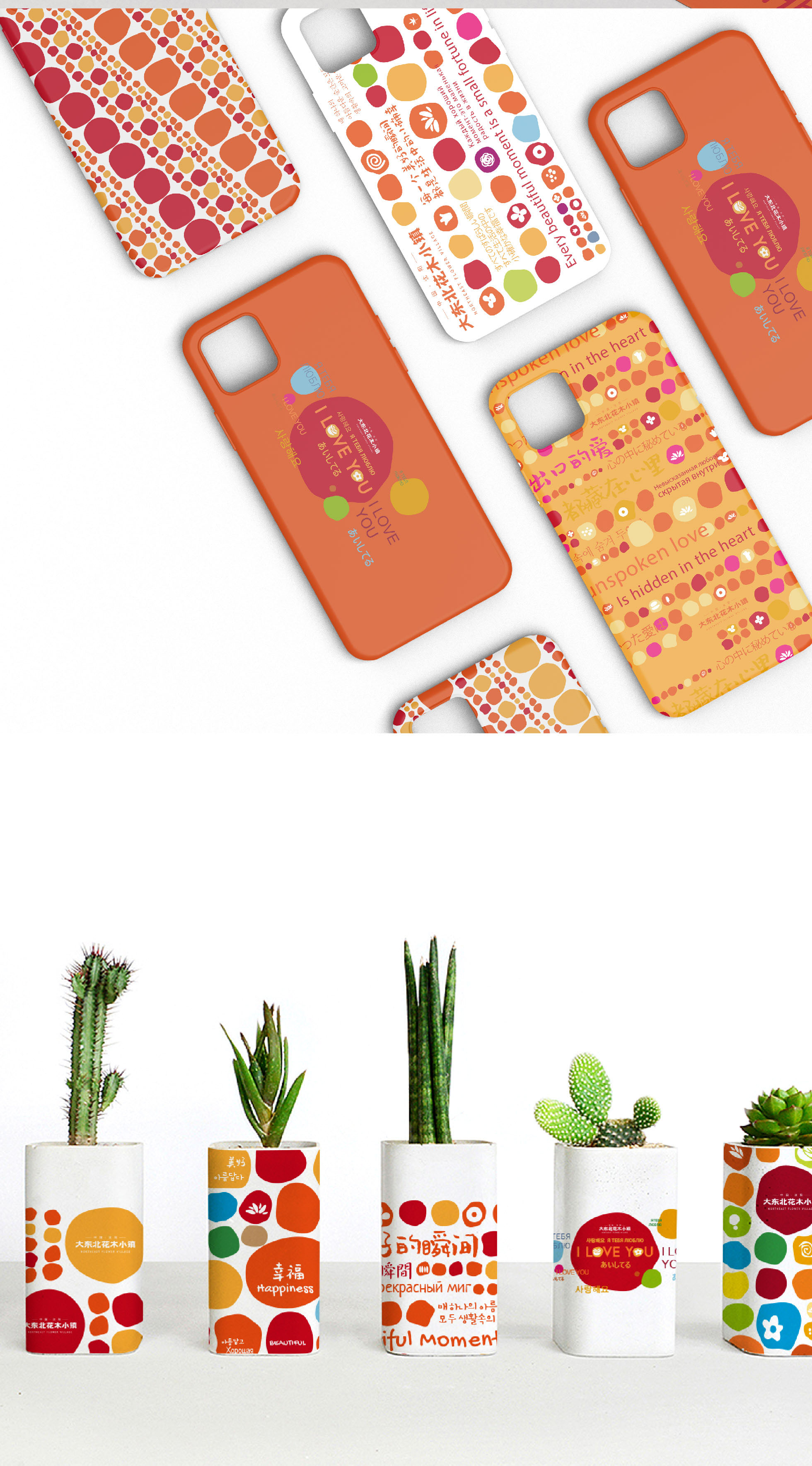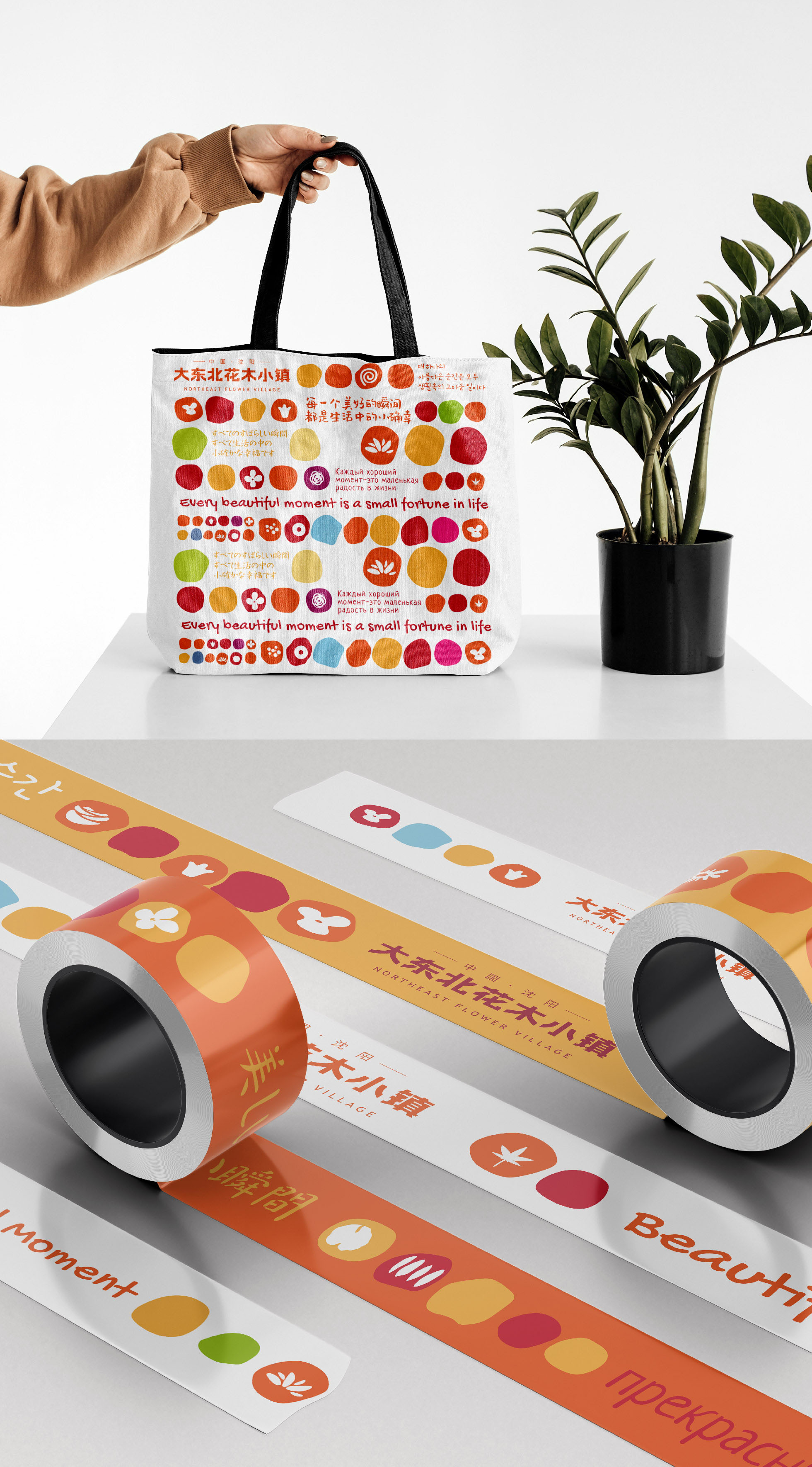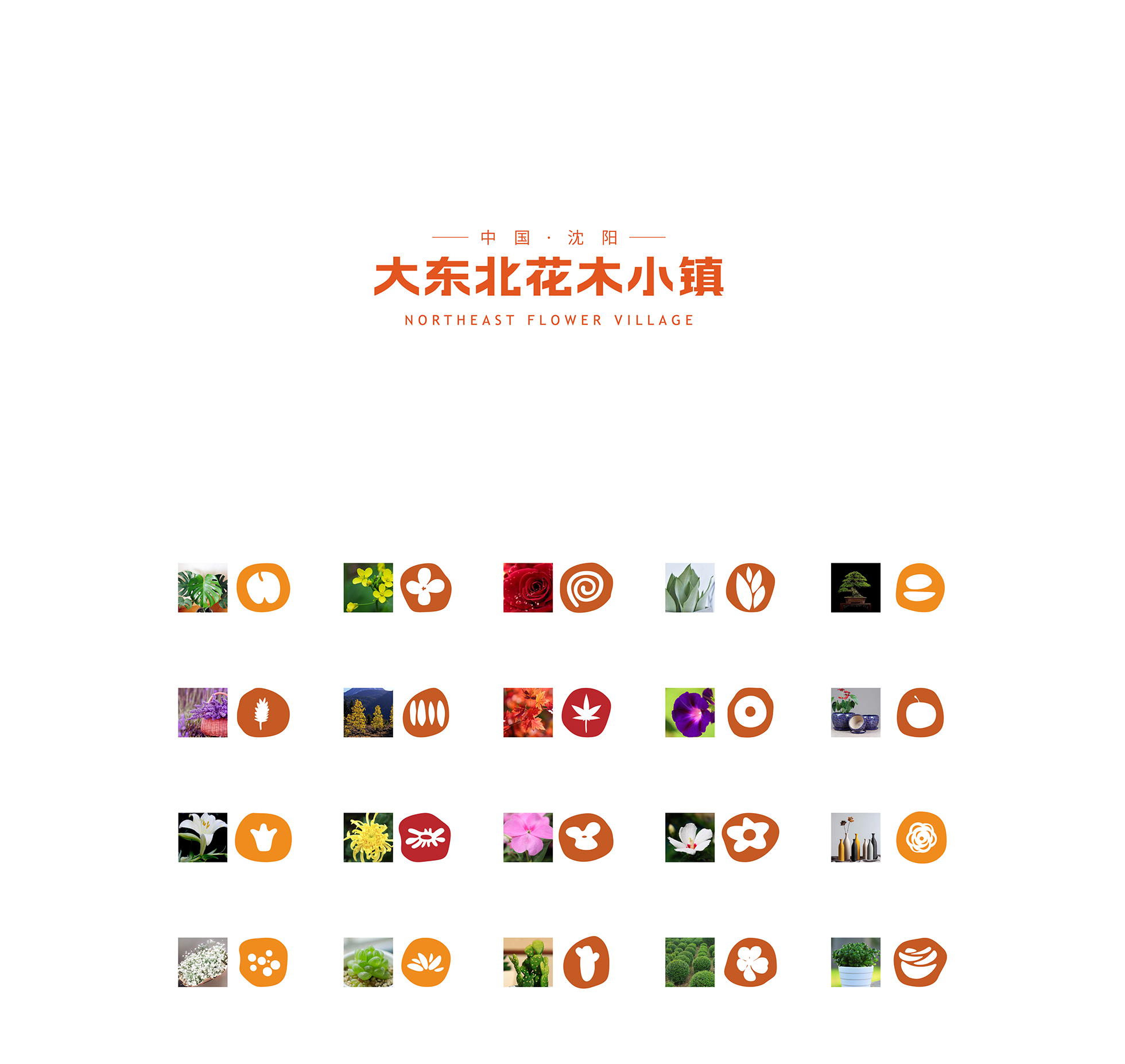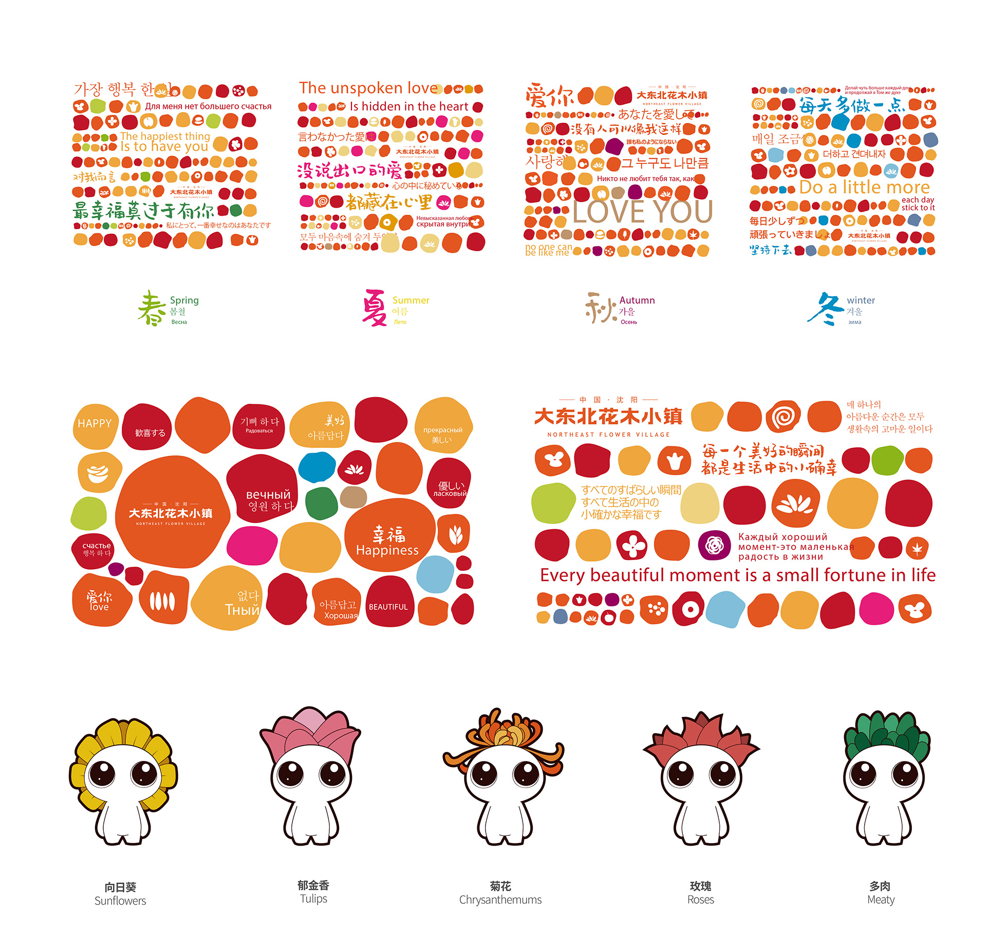 This series of works is the brand image of Northeast Flower Village.All the colors in the design works are taken from the representative flowers in the flower village.Through the combination of color blocks to form a special visual effect.The color changes of seasonal flowers in the four seasons form visual clues, connecting the inner logic of the town's business.The mascot image selected sunflower, tulip, chrysanthemum, rose, fleshy creation, extended to a variety of derivative applications.