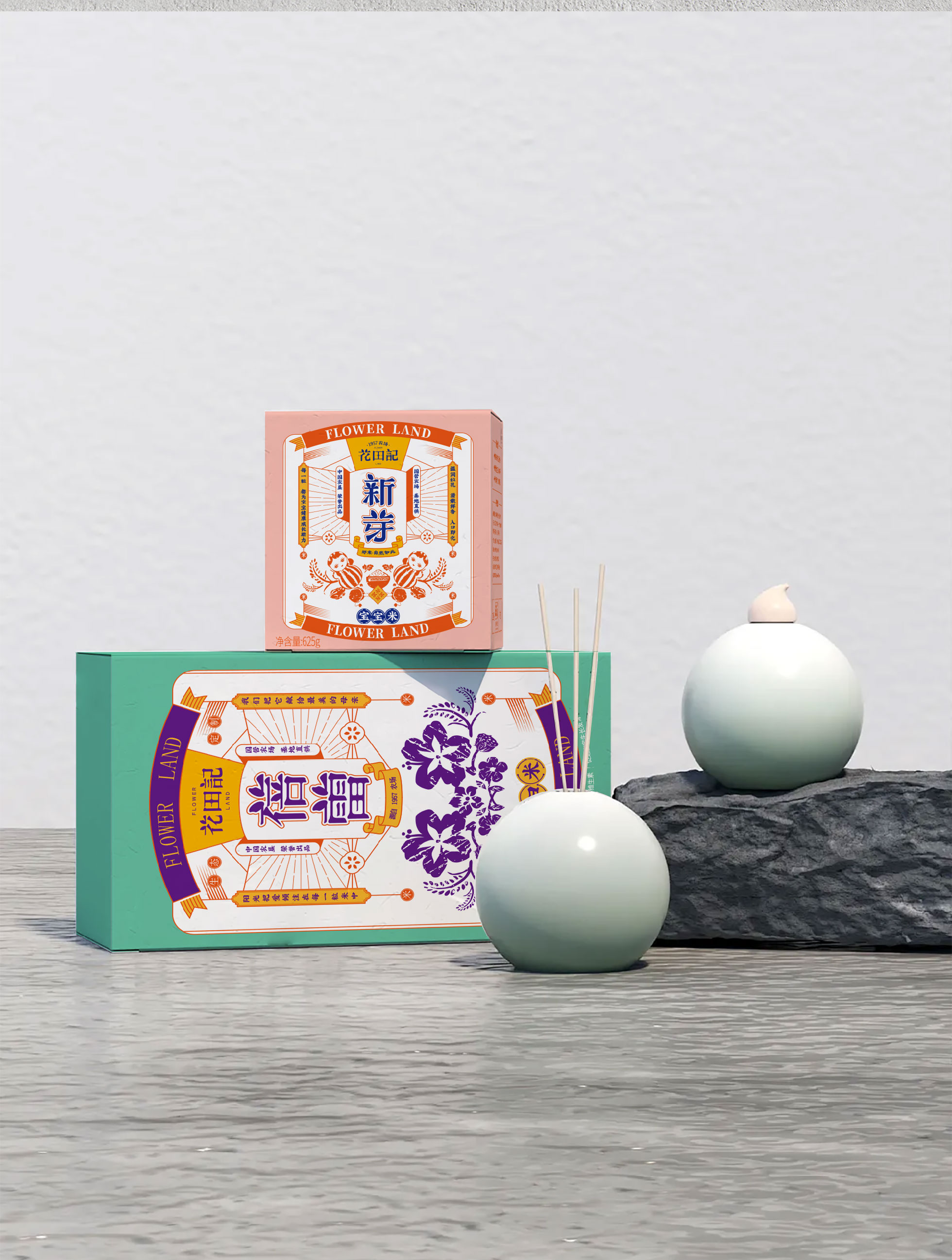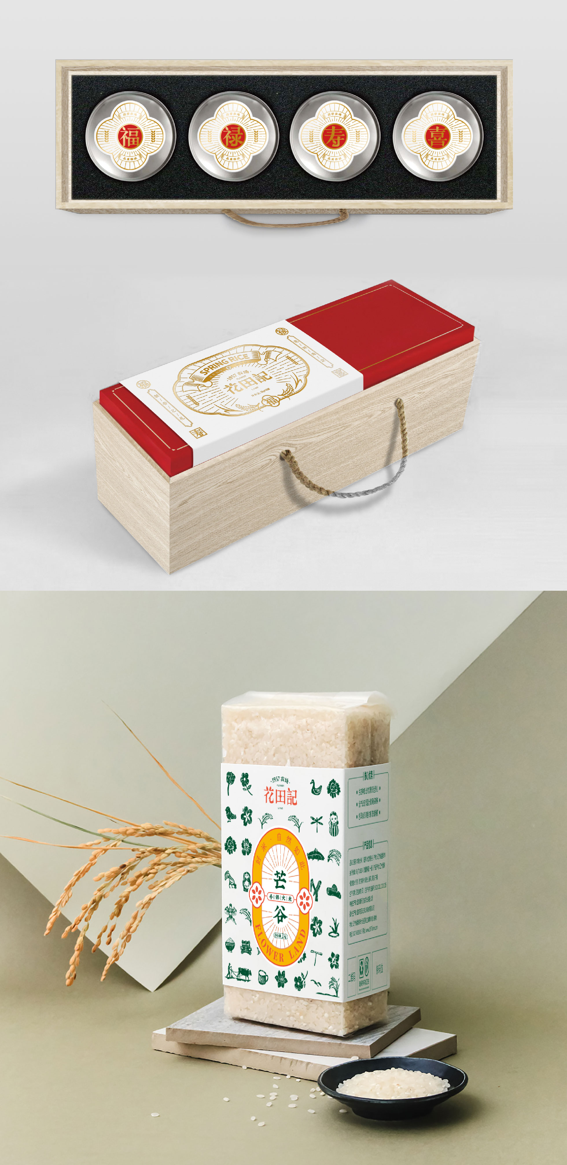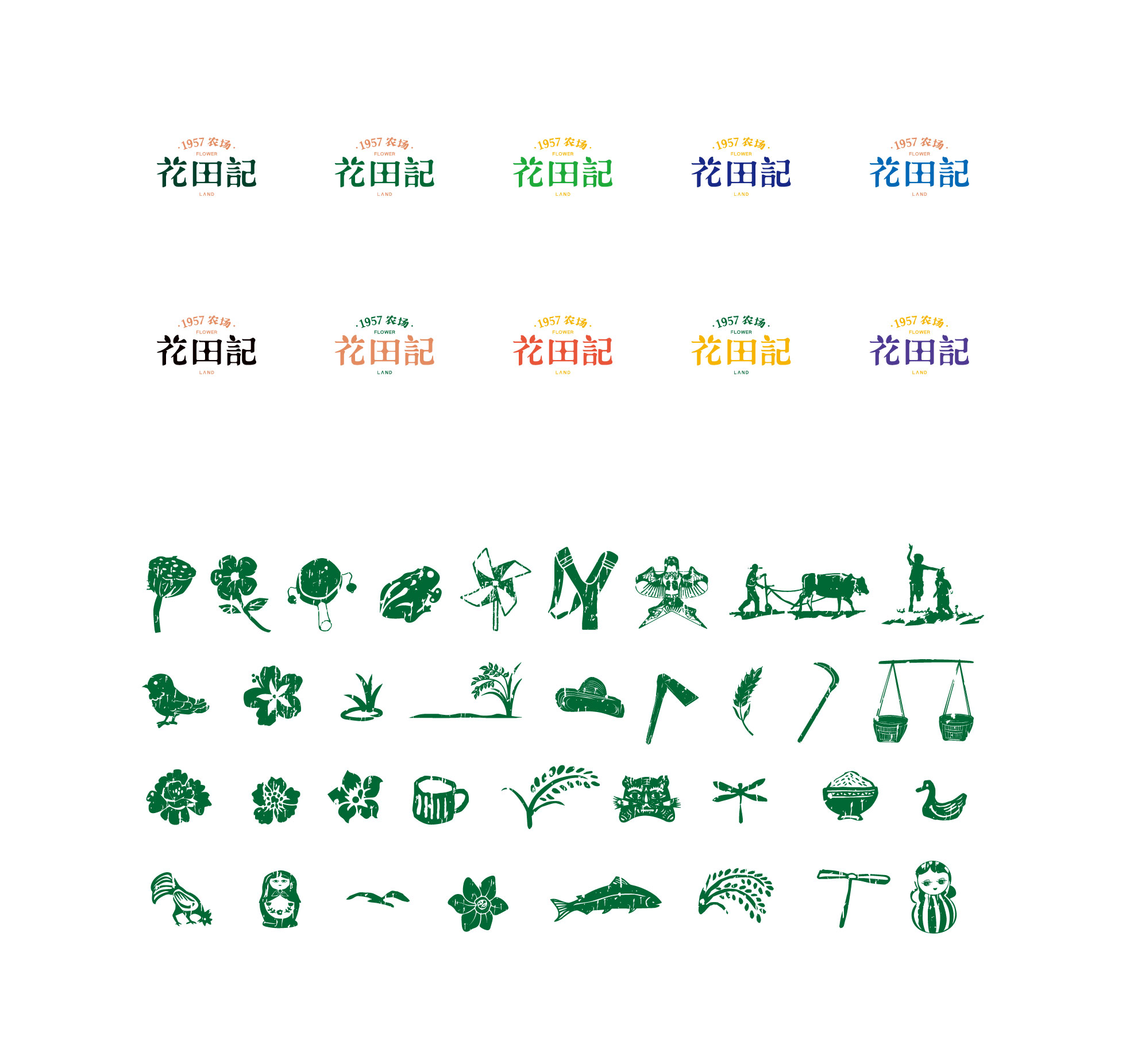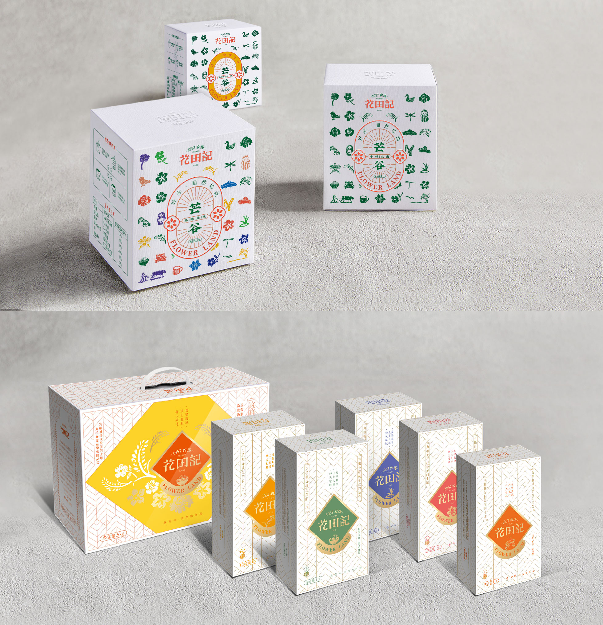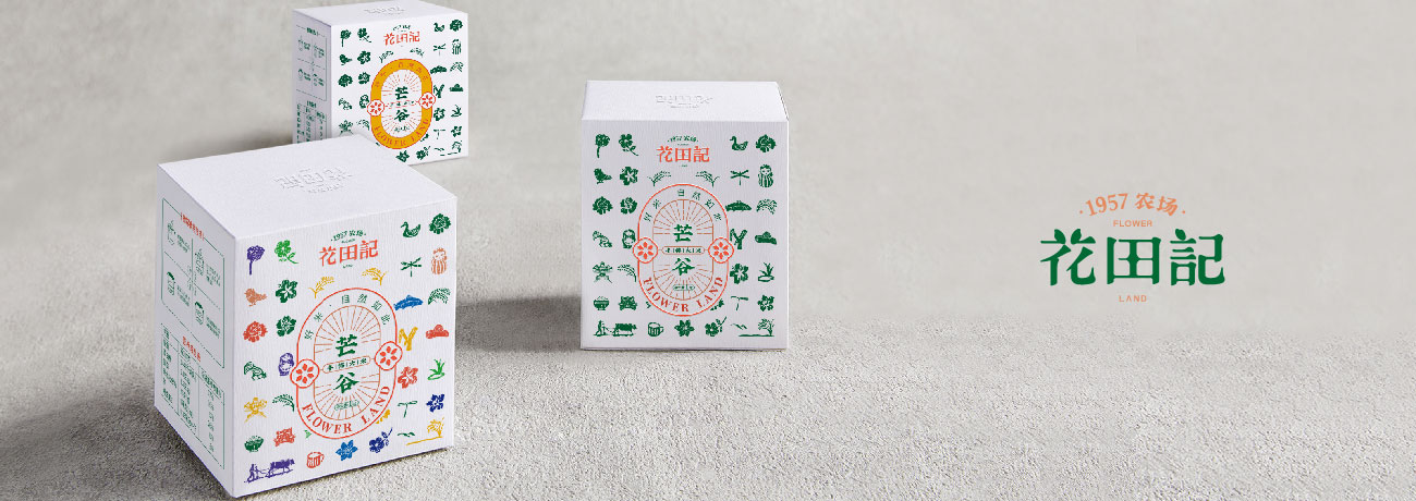 Flower Land was born in the state-owned Xinli Farm established in 1957, rooted in the fertile soil, looking for the most beautiful soil for vegetation, for food encounter love taste.Design element include rice, people pull cattle farming, rattles, swallows kites, tin frogs,swaddling clothes, bundles, all kinds of dolls, all kinds of flowers, livestock animals, fish, fruits and pears, fruits, Pufan, straw hats, daily clothing, hoes, sickles, tools, Great Leap Forward badges, currency tokens and tiger shoes, tiger hats, nine chains, etc.In Logo design, rice grains play an important role, embellishing the beautiful strokes of ancient Chinese characters, making the text instantly stained with the smell of the field.The text shape is smart and beautiful, giving Flower Land an elegant brand temperament.The strokes from the inscription rubbings and movable type printing represent the peak folk art in the agricultural civilization period. The auxiliary graphics take the basic shape of rice grains, extending a series