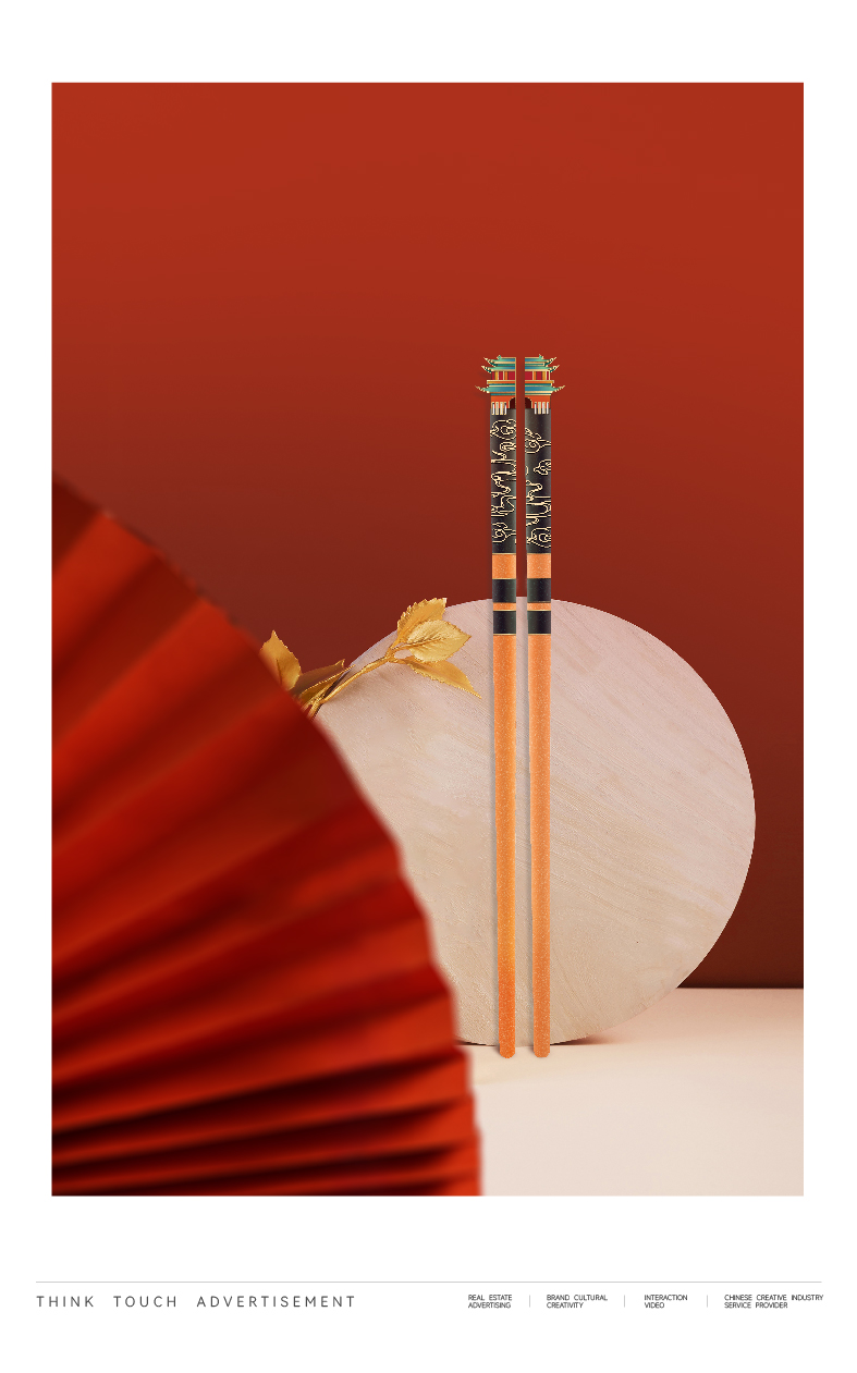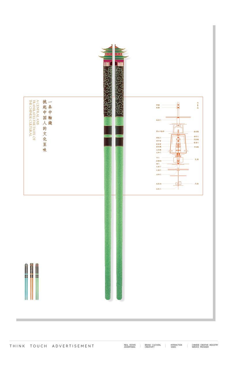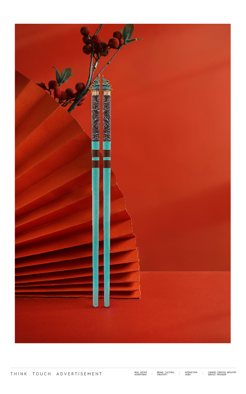 Chopsticks are a symbol of Chinese culture, symbolizing stability and prosperity.And this peace and prosperity is derived from the glorious history of China, so the straight chopsticks remind us of the central axis of the Chinese capital, the great building on the axis, is the place where our country comes to peace and security.We selected nine Chinese architectural landmarks, which symbolize China's vast territory and long-term stability.The architectural shape at the top of each chopstick shows the brilliant and shining side of Chinese architecture, and the chopsticks are printed with the traditional Chinese cloud pattern, symbolizing auspiciousness and happiness, meaning heaven's blessing and fortune.At the same time, we chose the unique Chinese colors, which connect the endless correspondence between human and nature, and also confirm the beauty of the Chinese land. Pick up chopsticks, start a kind of etiquette, one side is us, one side is the family, chopsticks pass the language and warmth of home, one side is us, one side is ancient civilization, chopsticks become our ritual of national rhyme.Design has never been more than the expression of the relationship between points, lines and surfaces, but the interpretation of the mysterious language of human collective civilization, Tang Dao's "Chinese good Chopsticks", translated the great Chinese symbols to the world, and became an interpreter of the Eastern spirit.