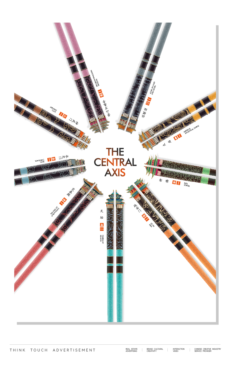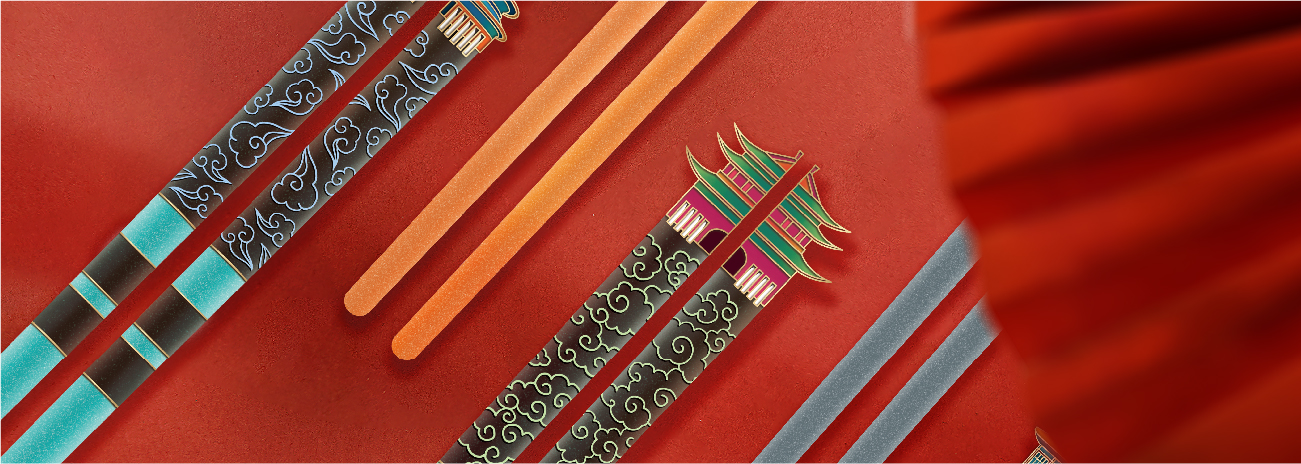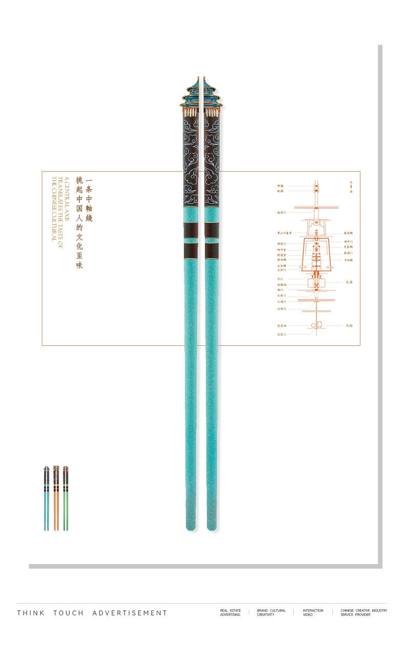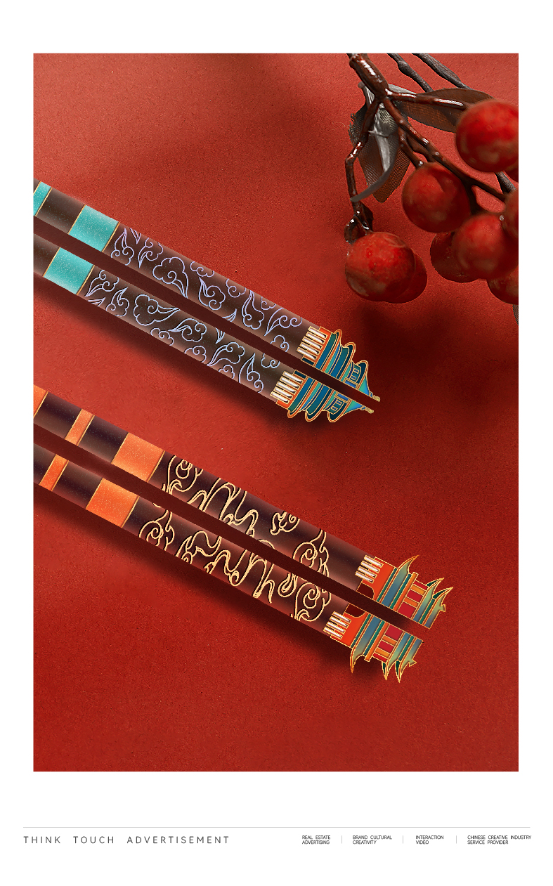 Chopsticks are a symbol of Chinese culture, symbolizing stability and prosperity.And this peace and prosperity is derived from the glorious history of China, so the straight chopsticks remind us of the central axis of the Chinese capital, the great building on the axis, is the place where our country comes to peace and security.We selected nine Chinese architectural landmarks, which symbolize China's vast territory and long-term stability.The architectural shape at the top of each chopstick shows the brilliant and shining side of Chinese architecture, and the chopsticks are printed with the traditional Chinese cloud pattern, symbolizing auspiciousness and happiness, meaning heaven's blessing and fortune.At the same time, we chose the unique Chinese colors, which connect the endless correspondence between human and nature, and also confirm the beauty of the Chinese land. Pick up chopsticks, start a kind of etiquette, one side is us, one side is the family, chopsticks pass the language and warmth of home, one side is us, one side is ancient civilization, chopsticks become our ritual of national rhyme.Design has never been more than the expression of the relationship between points, lines and surfaces, but the interpretation of the mysterious language of human collective civilization, Tang Dao's "Chinese good Chopsticks", translated the great Chinese symbols to the world, and became an interpreter of the Eastern spirit.